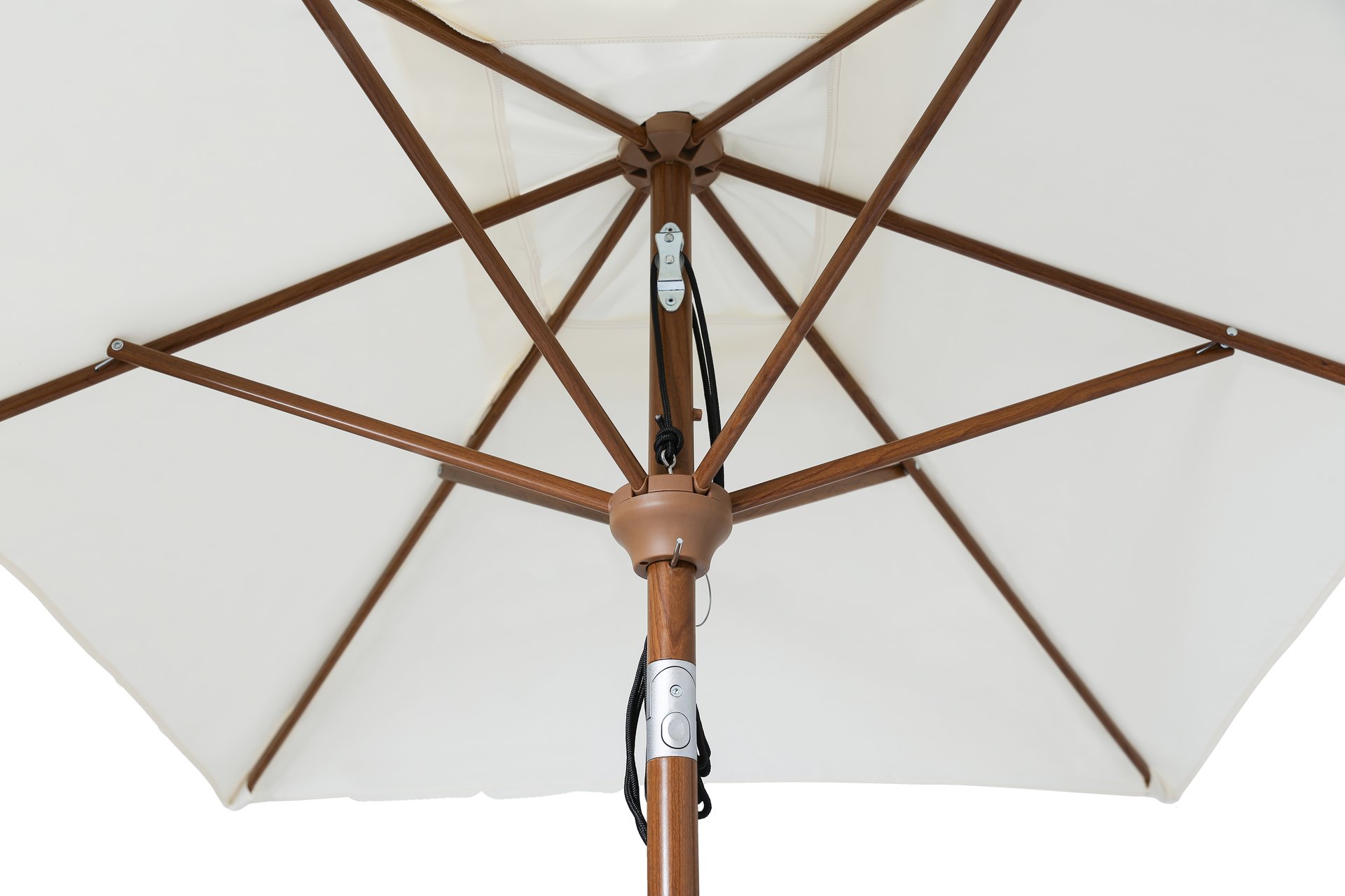 Tempo Amazon umbrella, close-up of the pulley mechanism and faux wood pole.