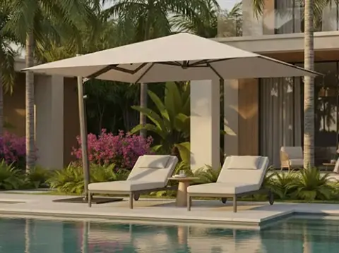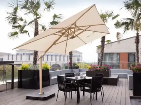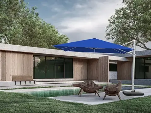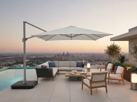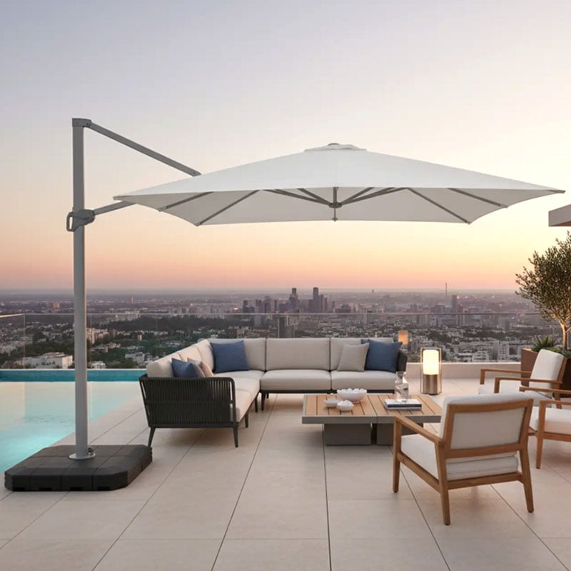 Geneva is a cantilever option for buyers who want to extend the range upward into more flexible patio and hospitality shade. It offers 360-degree rotation and all-direction tilt for cleaner layouts and better sun control.